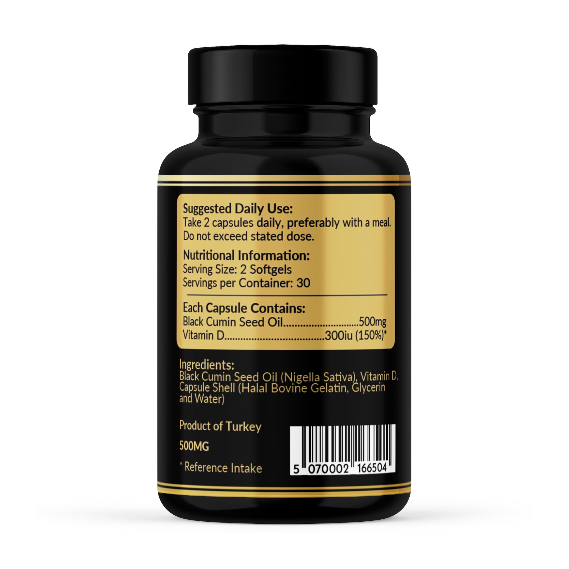 Black Cumin Seed Oil (Nigella Sativa), Vitamin D, Capsule Shell (Halal Bovine Gelatin, Glycerin and Water)